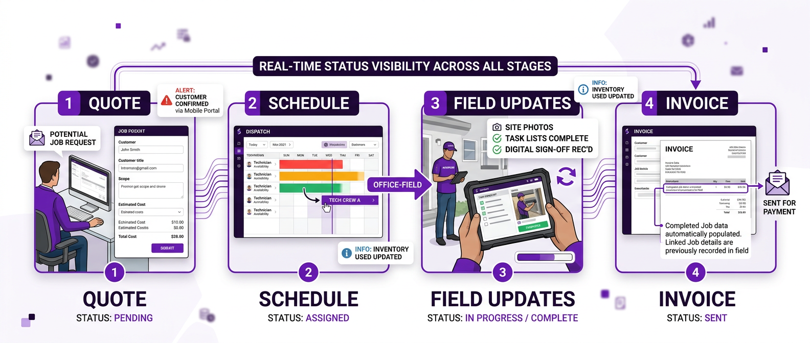Image concept: clean workflow diagram showing one job moving from quote to schedule to field updates to invoice inside a single connected system Highlight office-to-field visibility with real-time status, photos, task lists, sign-offs, and calendar coordination Use Intrflex-aligned visual direction: bold purple palette, dark text contrast, modern trade-operations feel, no generic handshake stock imagery Show mobile crews and office staff connected through one source of truth Support the idea of business process consolidation with a practical visual rather than abstract tech imagery